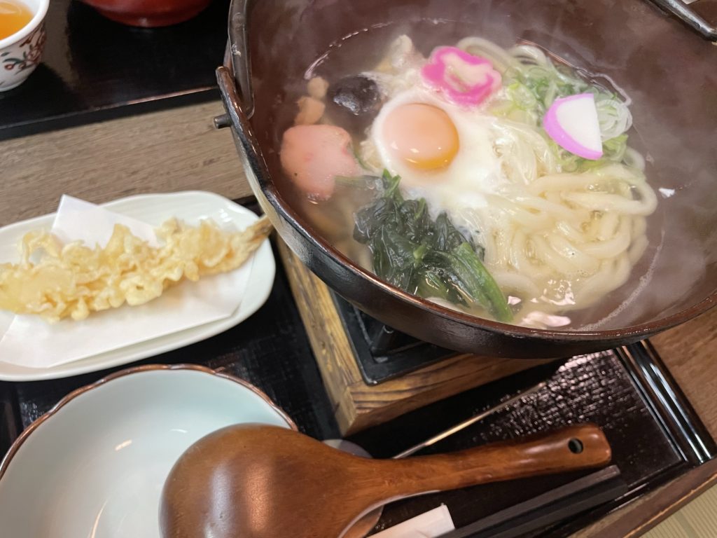 寒い時の鍋焼きうどん、最高ですね。火が付いたままのアツアツで出てきました。