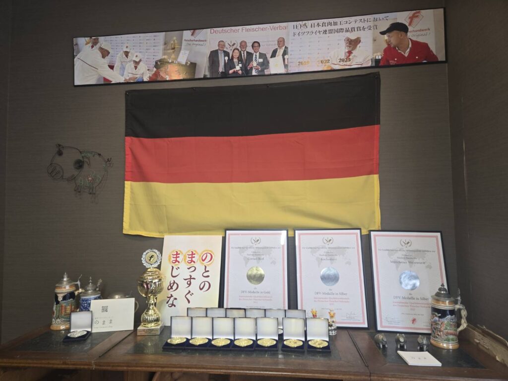 のままソーセージの工房がある羽咋本店には、2019年からの出品で受賞した数々の賞状やメダルが飾られています。