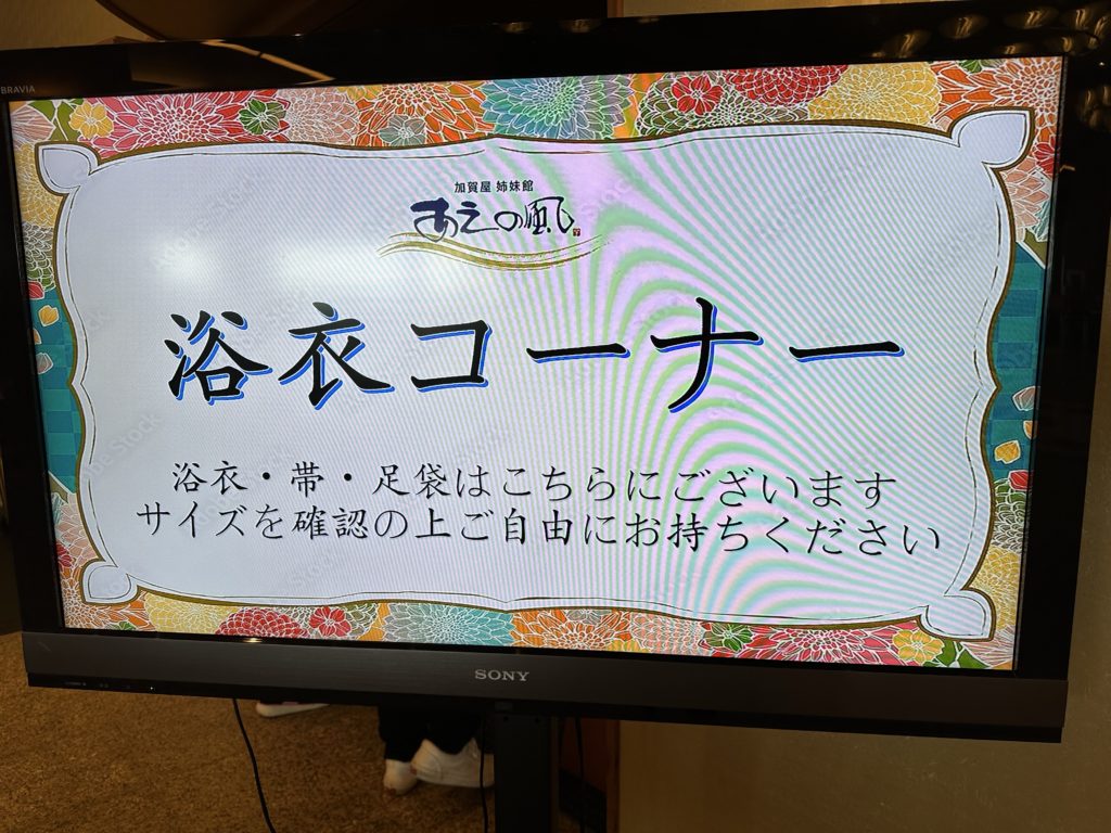 以前は、浴衣はお部屋に置かれているのが当たり前でしたが、今は、自分で選んでお部屋に持って行くスタイルが増えてきました。あえの風さんもそのスタイルでした。自分のサイズがわからない方のために、身長が測れるようになっているのもありがたいですね。