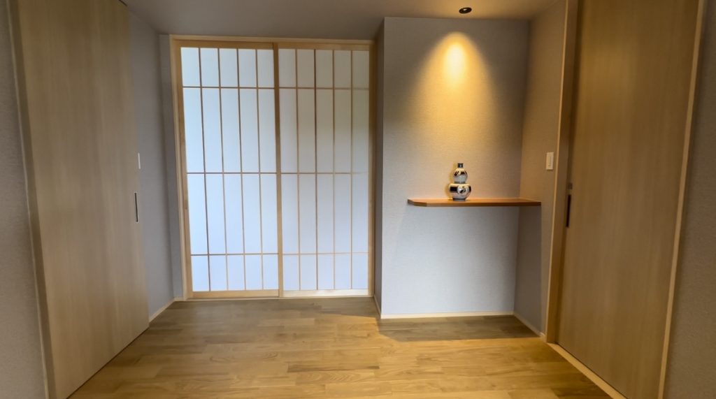 寝室も和テイストで、かなり落ち着けます。正面には地元の伝統工芸である田鶴浜組子が使われています。