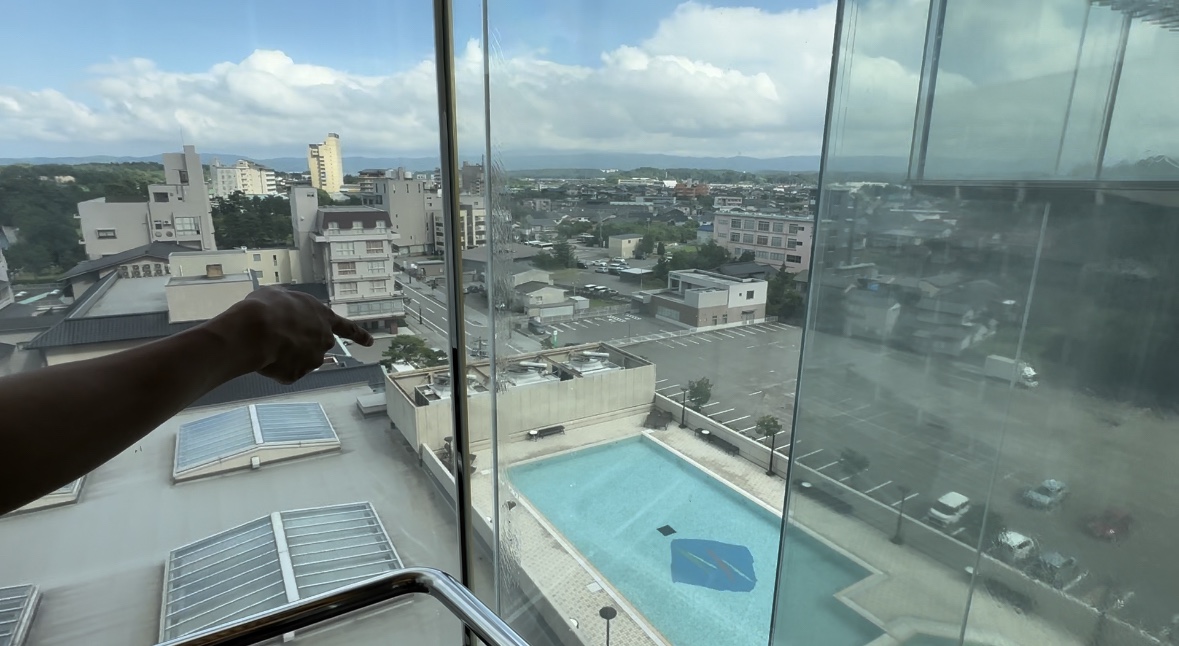 最上階の9階へ向かうエレベーターからの景色です。夏場にオープンしているプールも見えました。