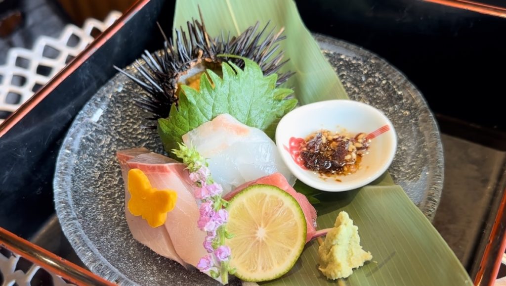 こちらのお刺身の小鉢に入っているのは、食べる醤油「サクサク醤油」という調味料で、お刺身に乗っけて食べると香ばしくてとてもおいしかったです。