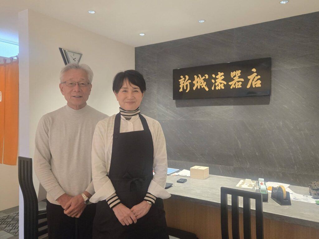 取材時には、輪島塗の看板の前で新城様ご夫妻に並んでいただき撮影させていただきました。
