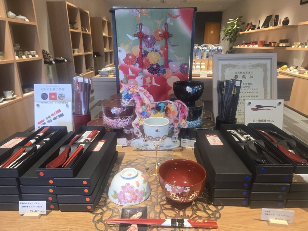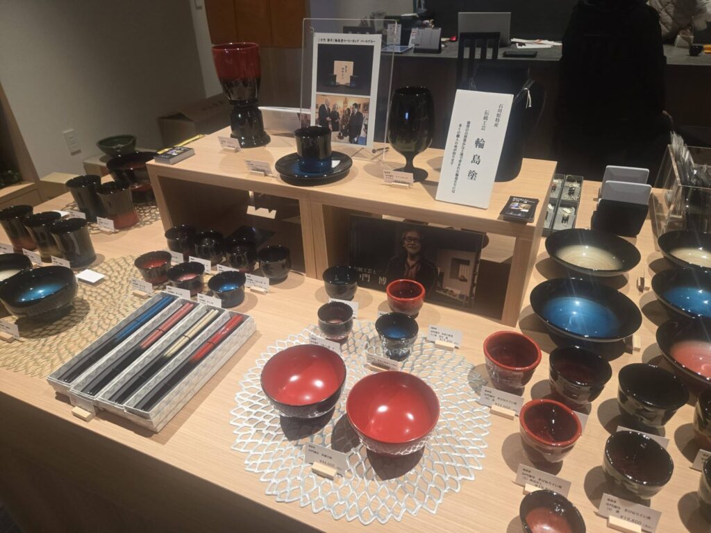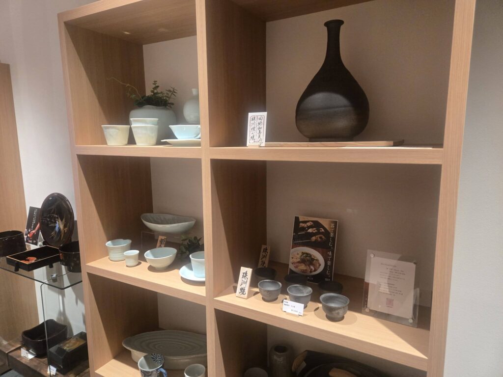 店内に一歩足を踏み入れると、能登の自然豊かな土地で育まれた輪島塗をはじめ、能登島の陶房独歩炎の作品、珠洲焼、加賀百万石の九谷焼、山中塗など石川県を代表する伝統工芸品が美しくディスプレイされています。