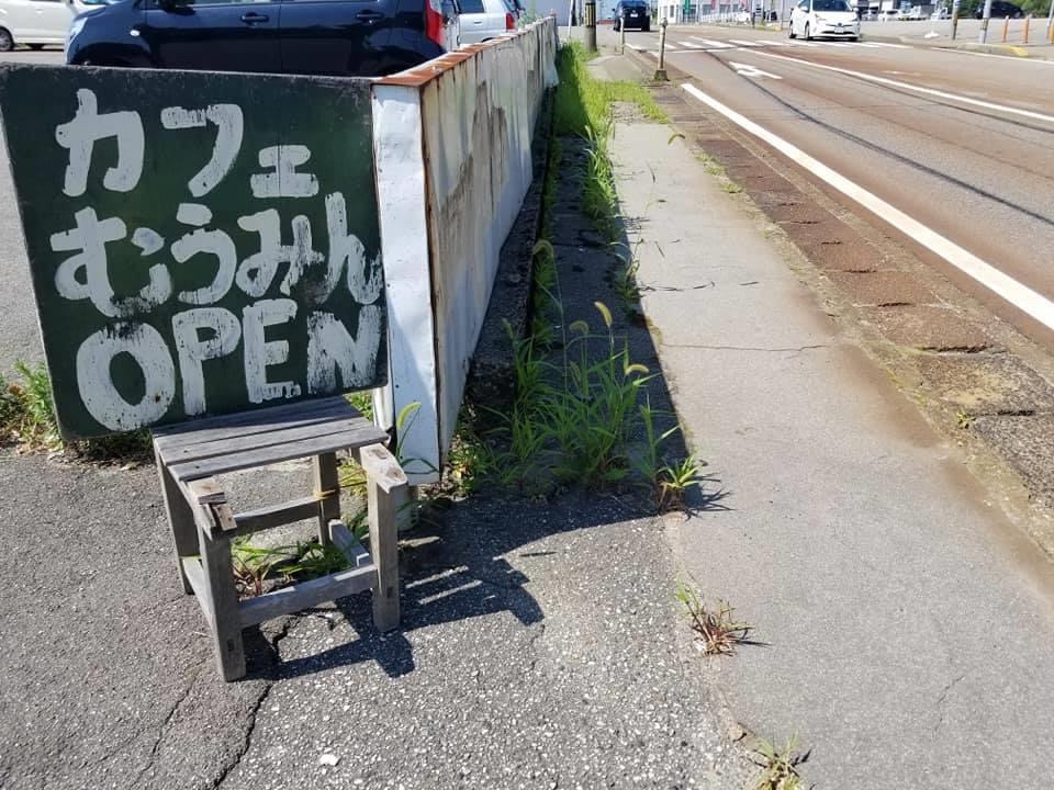 羽咋市能登里山街道IC「猫の目」近く。手作り看板とオレンジ色の平屋屋根が目印。