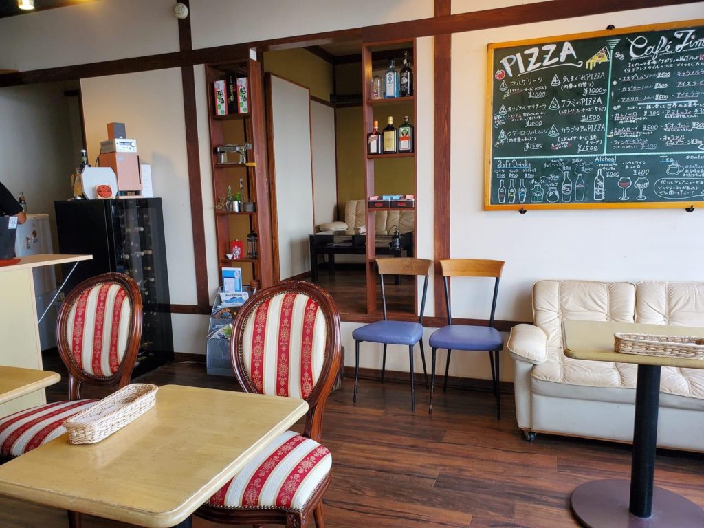 右手に進むとテーブル席とソファー席、壁には黒板に書かれたメニューがあります。