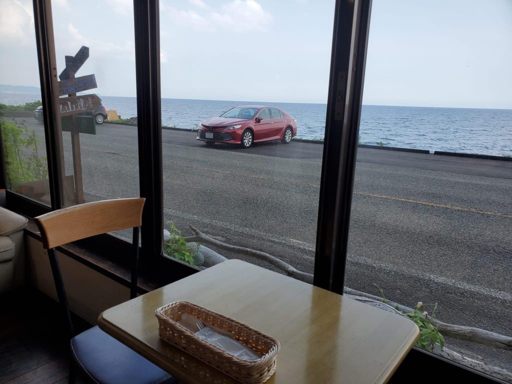 手前の窓際の席からもきれいに海が見えます。