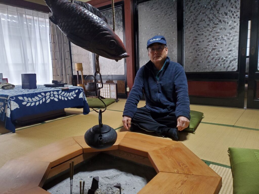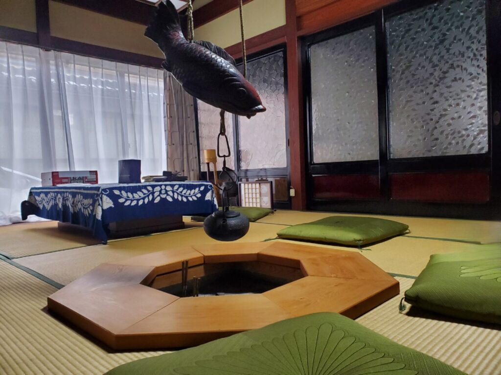 玄関を入って左側のお部屋に案内して頂きました。そこは囲炉裏がある落ち着いたお部屋です。この囲炉裏を囲んでどぶろくと美味しい鍋を食べることができるそうです。