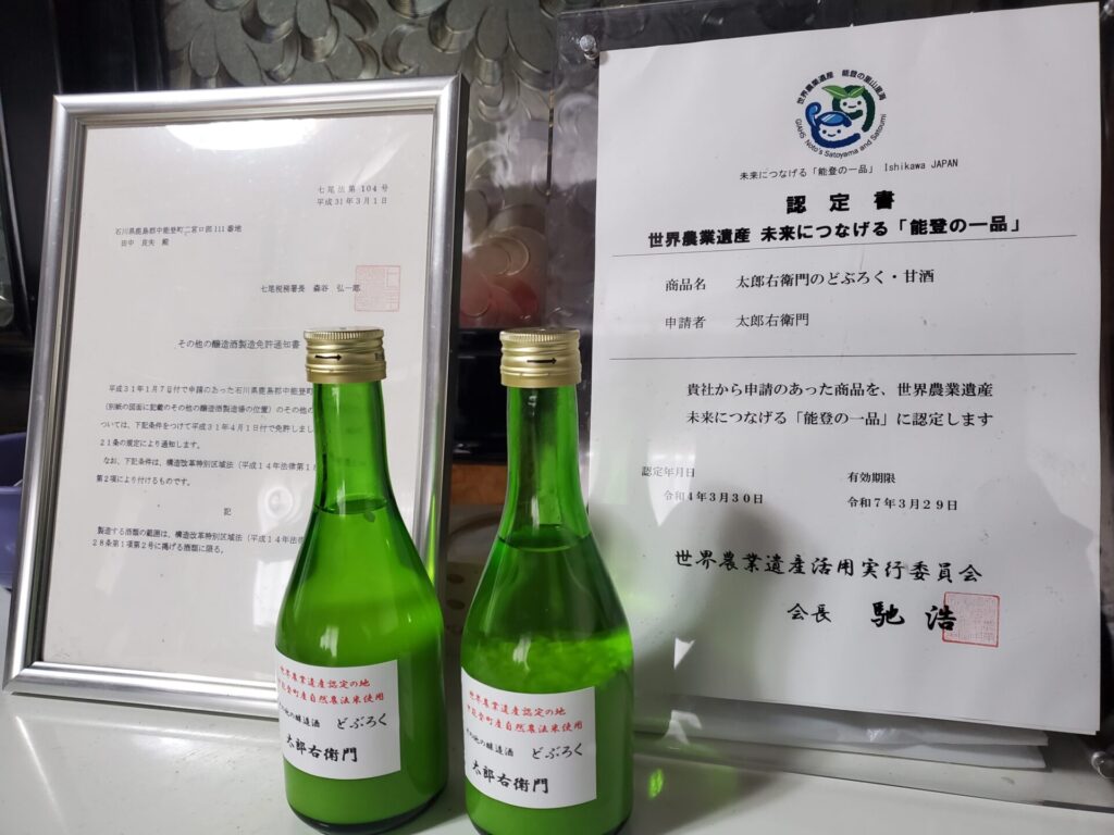 太郎右衛門のどぶろくと甘酒は、世界農業遺産 未来につなげる「能登の一品」に認定されています。
