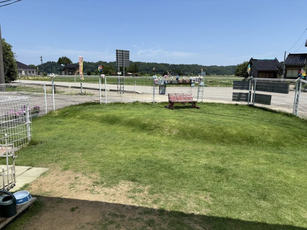 芝生が植えられた広いお庭でワンちゃんは遊びたい放題です。