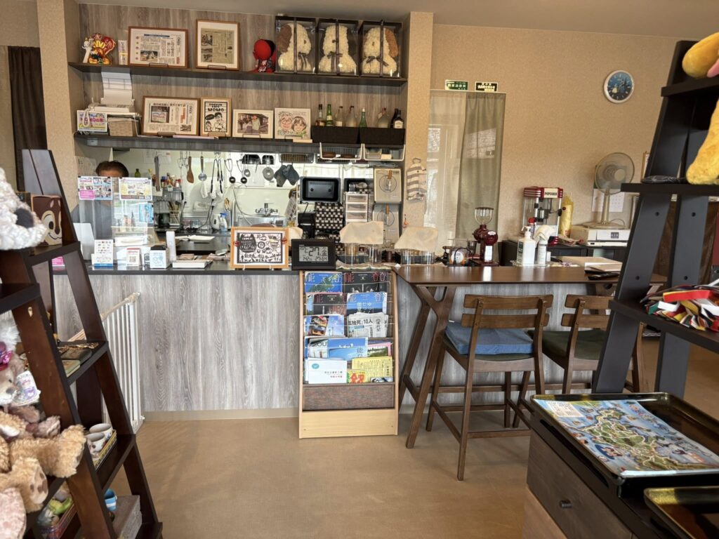 カフェの玄関を入ると、正面にカウンターがあります。入口の両側には、可愛いぬいぐるみや小物が飾られています。能登島の観光案内パンフレットも置かれています。
