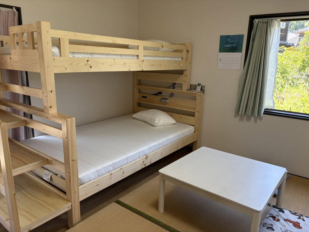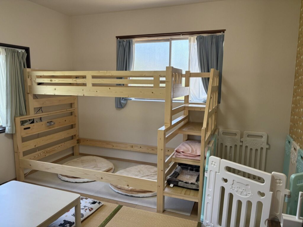 お部屋は2段ベッドがあり、下段はセミダブル、上段はシングルになっています。わんちゃん用のゲージもあります。