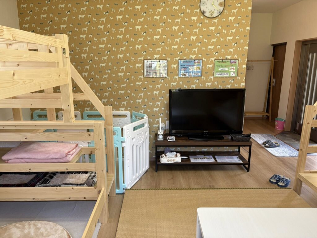 「ドッグランカフェMOMO」に、待望の宿泊施設がオープンしました。その名も「わんことお泊りMOMOの家」。愛犬家の皆様に、気兼ねなく、そして心からリラックスした時間をお過ごしいただきたいという想いを込めて、一日一組限定の宿です。最大4名様までご宿泊できます。