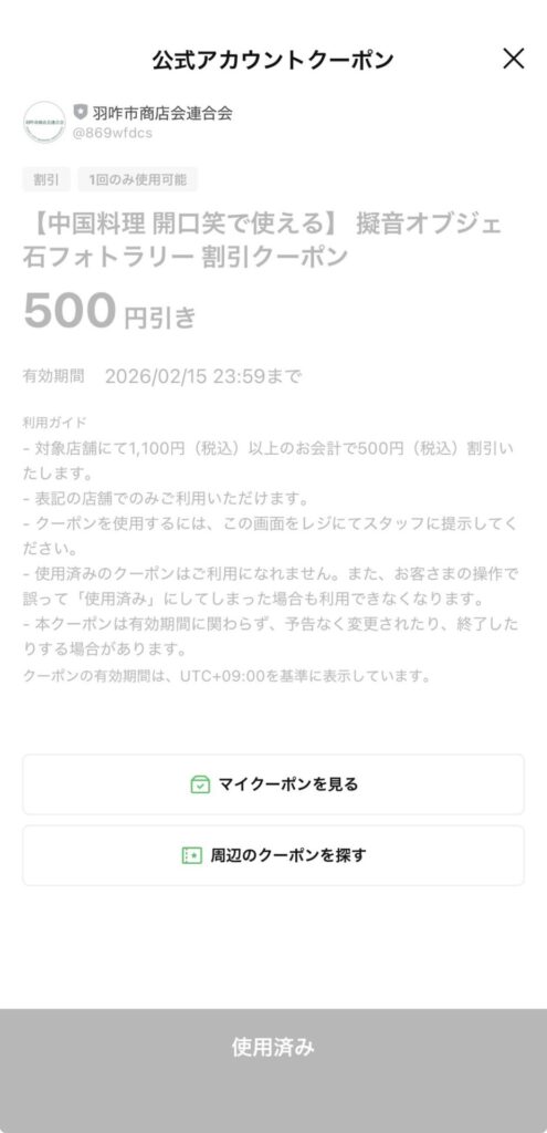 ここからはお店の方に確認して貰って進めて下さい。うっかり使用済みにすると使えなくなります。