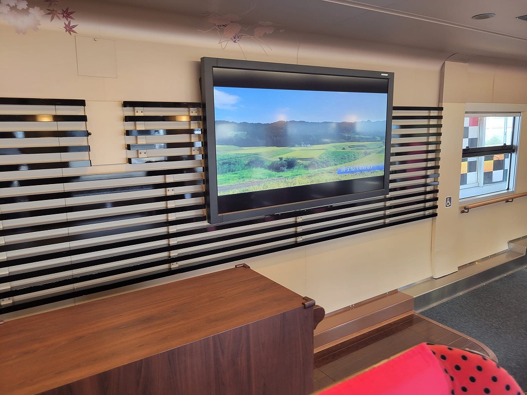 2号車の中央には、能登の紹介映像が流れるモニターと、演台が設置されています。