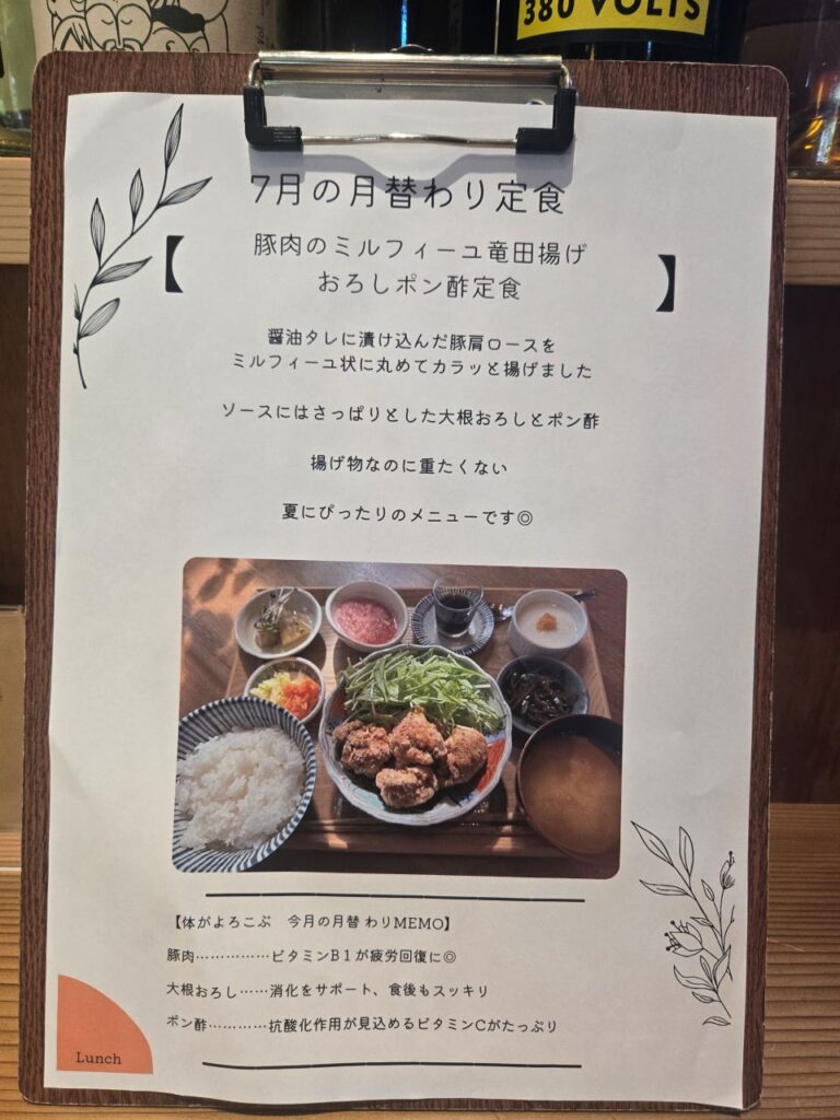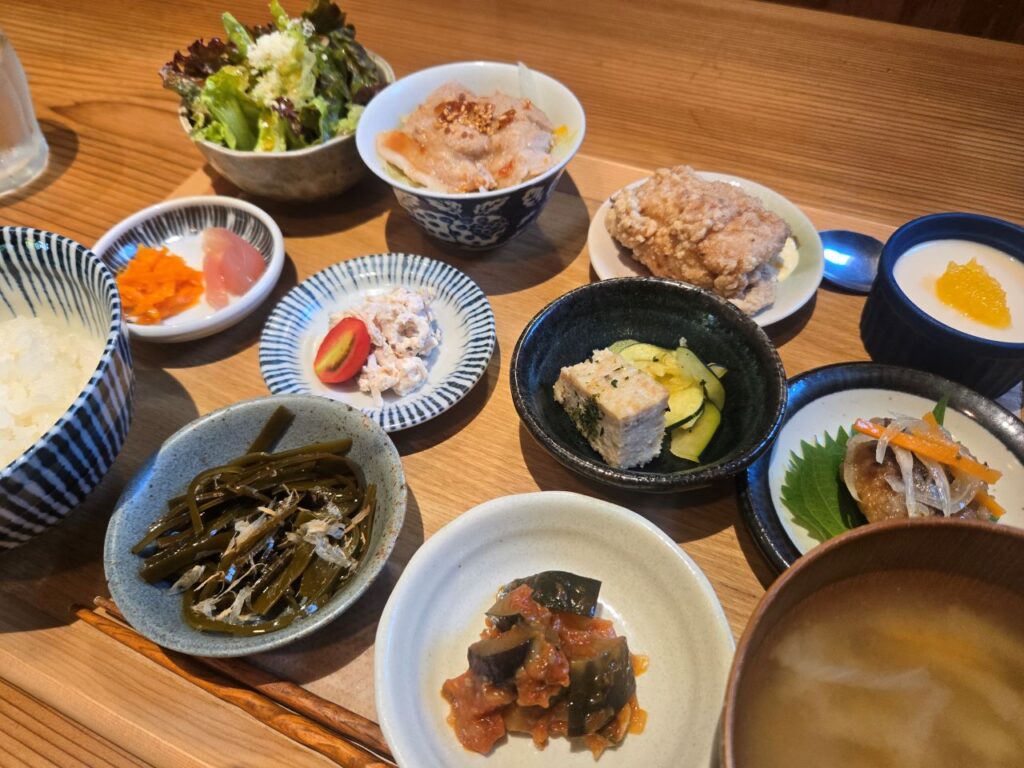唐揚げはカリッとジューシーで、温しゃぶのサラダはさっぱりした味つけ。ピクルスやおひたしなどの野菜も多く、体に優しいのが伝わってきました。どれも丁寧に作られていて、ご飯がどんどん進みます。