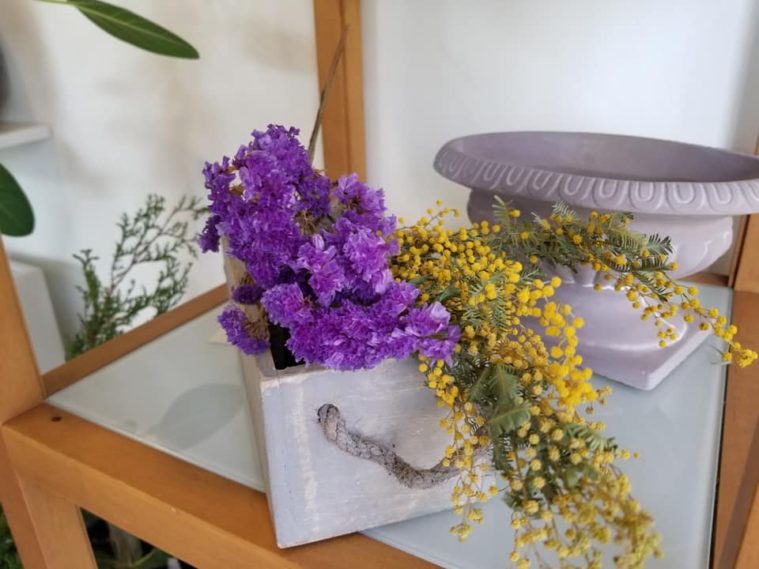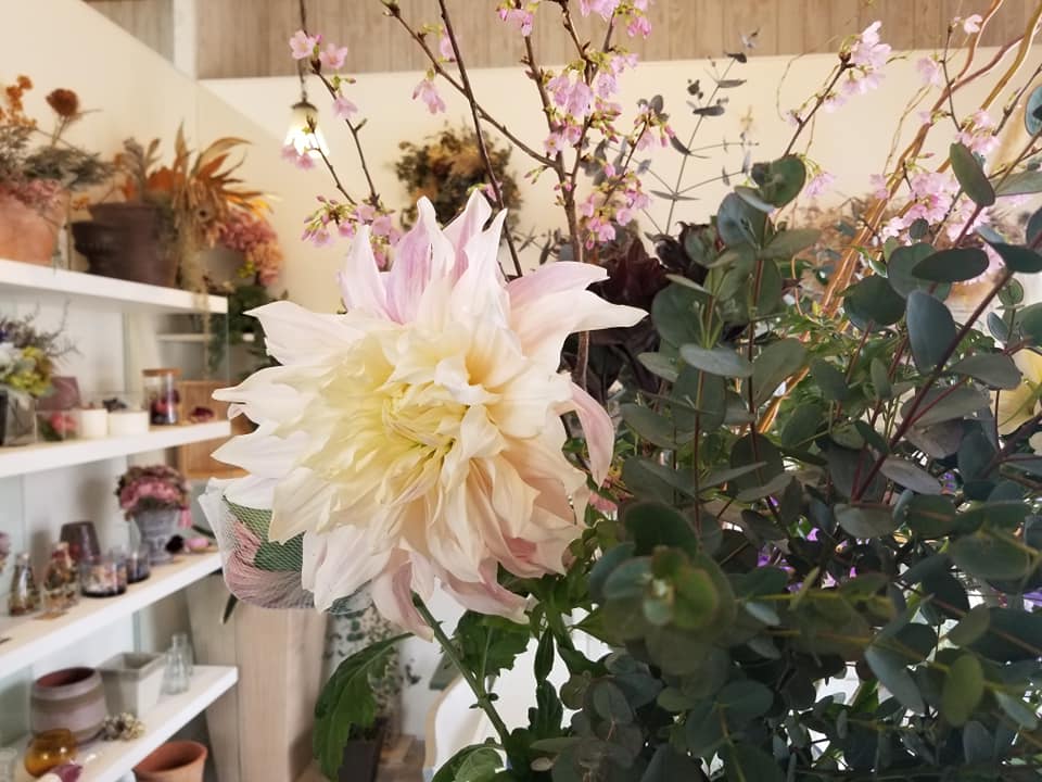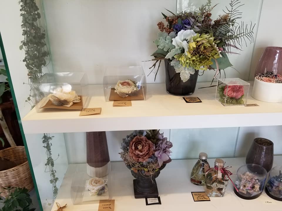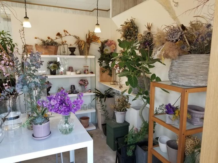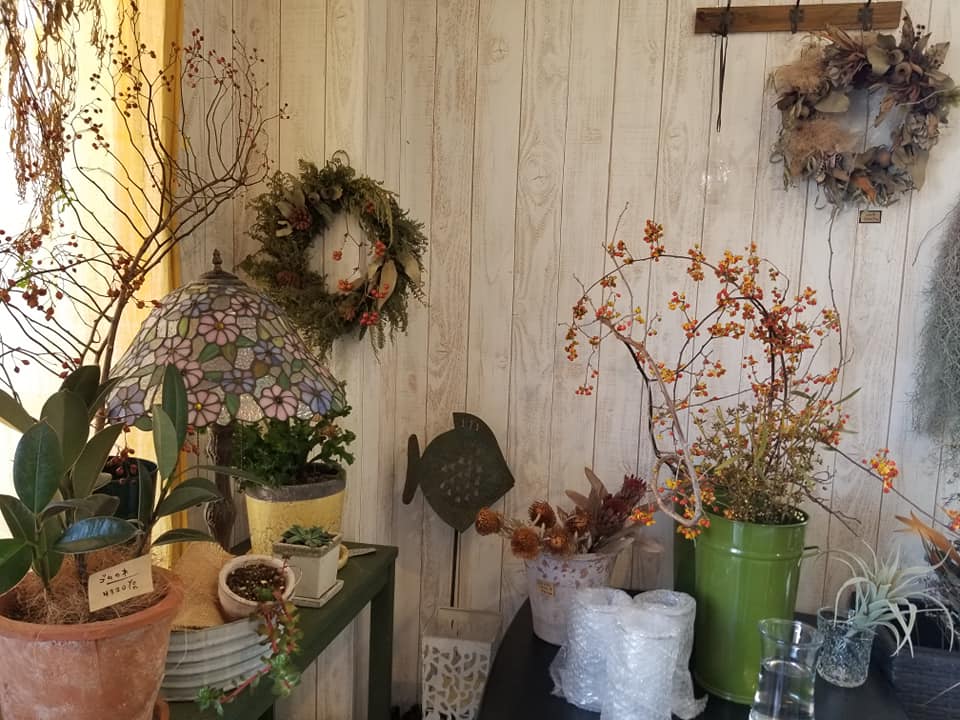 店内はこじんまりとしながらも、狭さを感じさせない配置で生花からリース、ドライフラワーもありました。