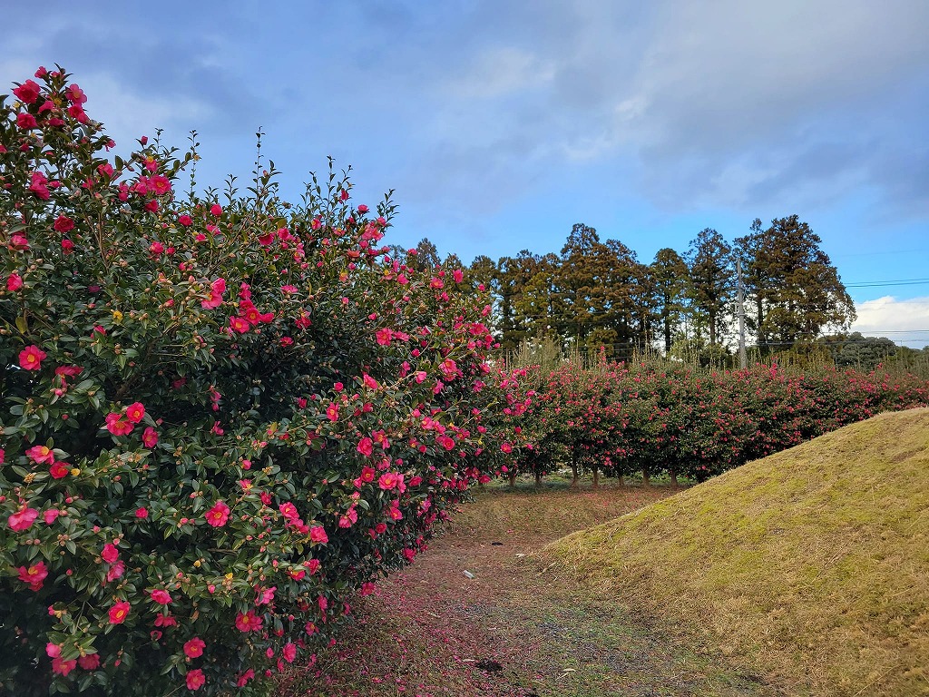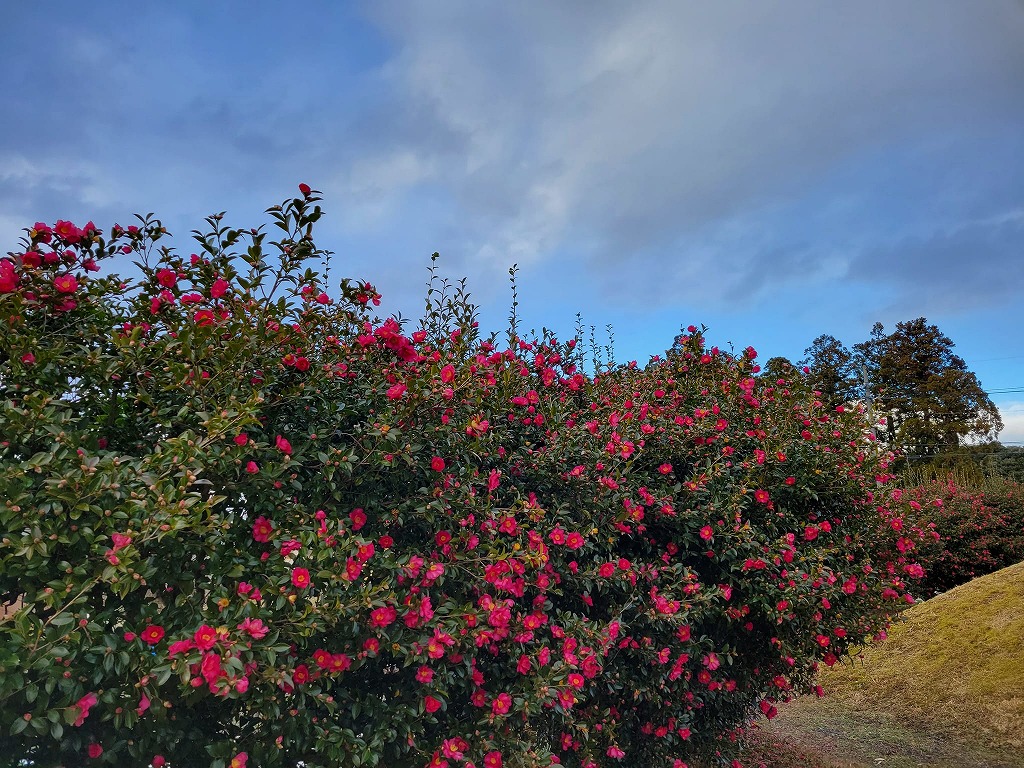 山茶花が咲き誇る古墳