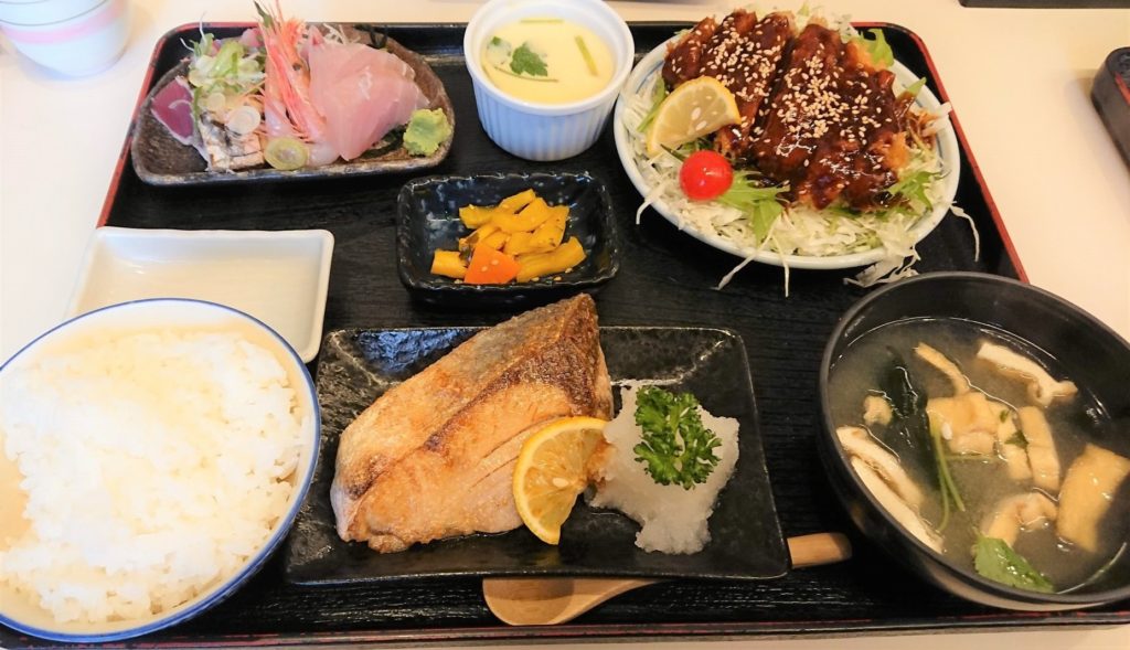 刺身にとんかつに焼き魚、ご飯にお味噌汁と香の物、さらに茶碗蒸しまでついてボリューム満点です。