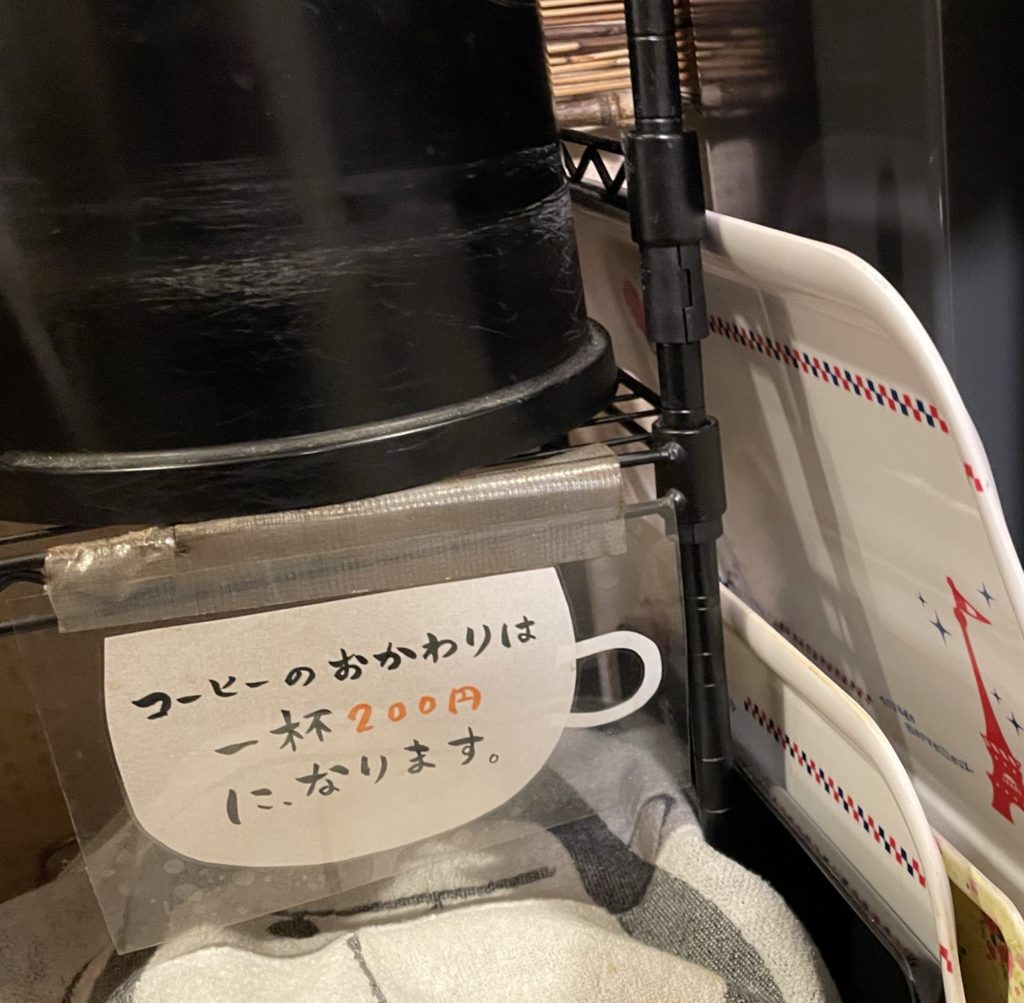 上記のメニューは、昼、夜共通ですがランチタイムにはコーヒーが付きます。セルフサービスで、一杯無料です。