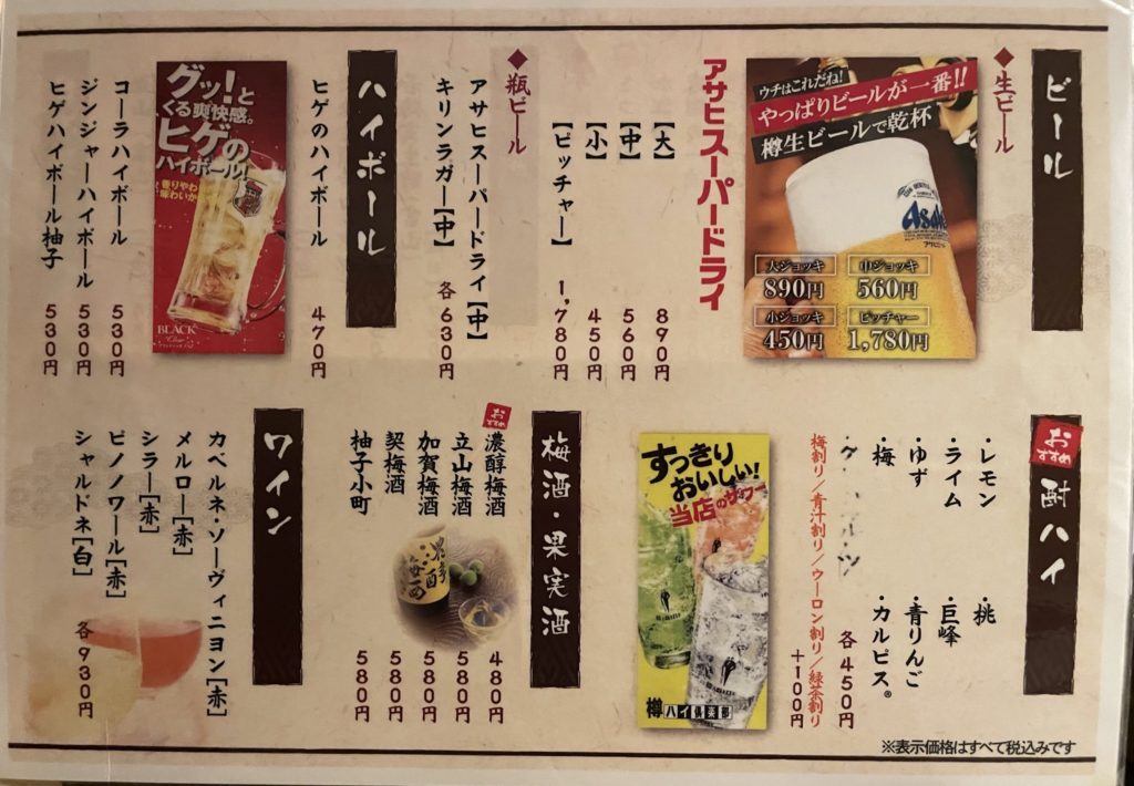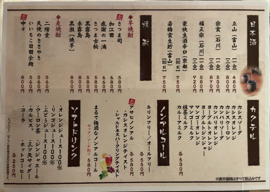 日本酒、焼酎、カクテル、ノンアルコール、ソフトドリンク、ビール、ハイボール、酎ハイ、梅酒・果実酒、ワインが揃っています。
