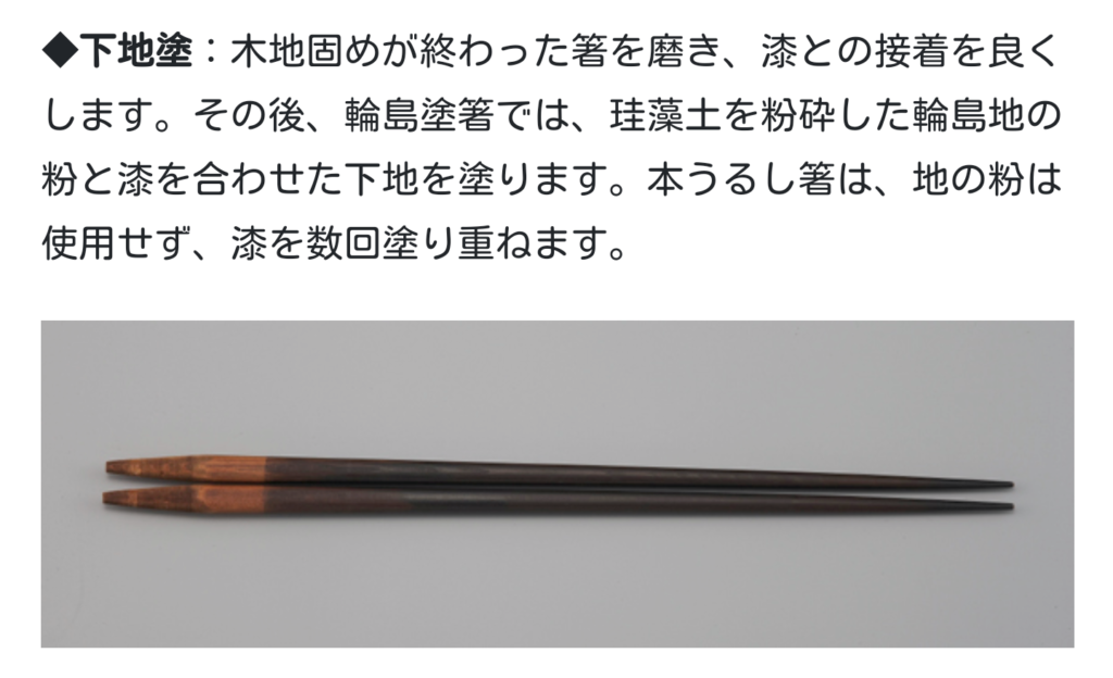 輪島うるし箸とは、木製木地(ヒバ・アテ等)で上塗りが天然うるしを使用して作られていたとしても、地の粉下地が施されていない箸、または下地や箸の頭部分の一部でも合成樹脂塗料を使って仕上げた箸のことをいいます。