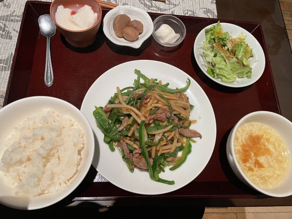こちらは牛肉とピーマンの細切り炒め。メインはもちろん、スープも杏仁豆腐も美味しかったです。
