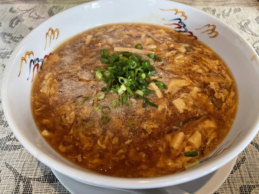 こちらは、酸辣湯麵です。細切りの肉に、溶き卵たっぷりのあんかけで、いつまでも温かく食べられて寒い時に最高です。