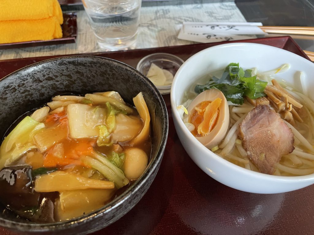 ミニ丼ミニ麺セットもボリュームがあっておすすめです。この日の丼は五目丼でした。甘めの餡が絡んだ歯ごたえの残った野菜がとてもおいしかったです。