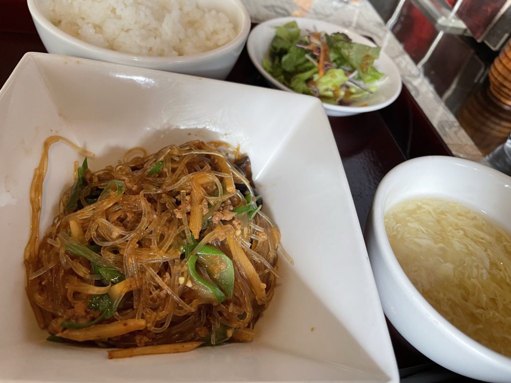 この日の週替わりメニュー、麻婆春雨のBランチ。豚肉と青菜と玉子の炒めのBランチ。