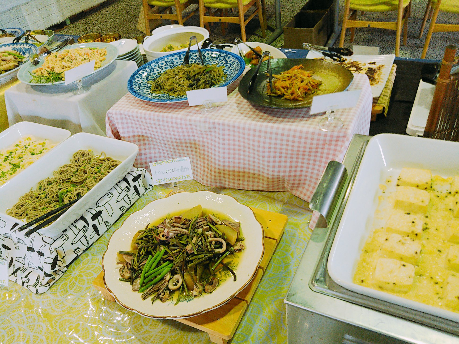 肉じゃが、卯の花、きんぴら、山菜の煮物など自社農園の野菜や、近くでとれた山菜を使った季節のお料理が山ほど並びます。どれを食べるか迷います!