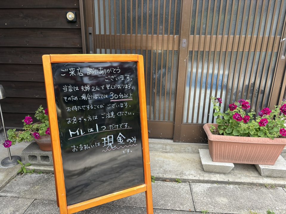玄関の前にある案内板には、ご夫婦二人でされていますので、「30分以上お待たせすることもあります。トイレは1つです。お支払いは現金のみです。」と書かれています。