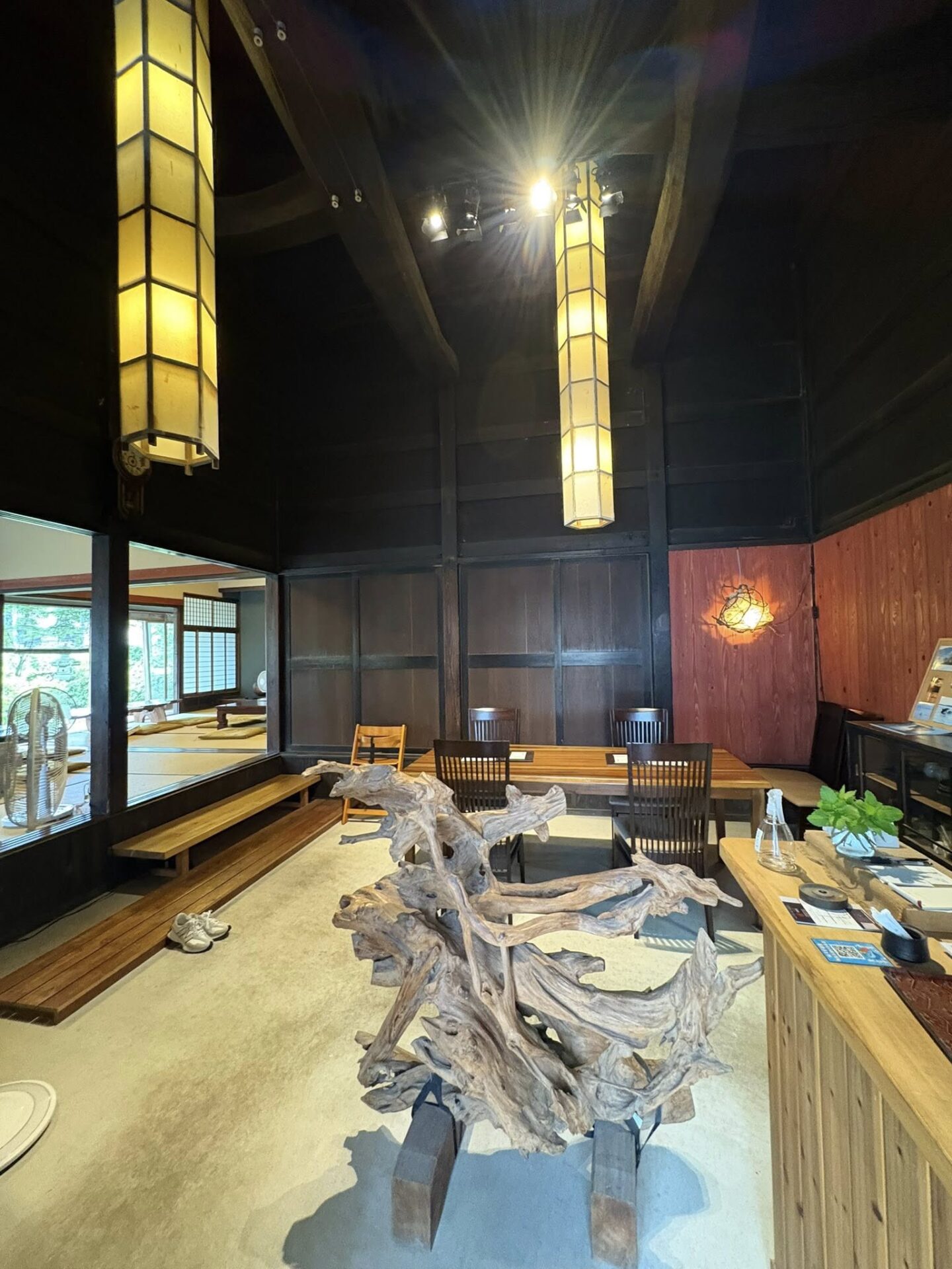 古民家の趣をそのままに、玄関をくぐると広がる高い屋根と心落ち着く空間。蕎麦の香りと共に、特別なひとときを楽しめる場所です。
