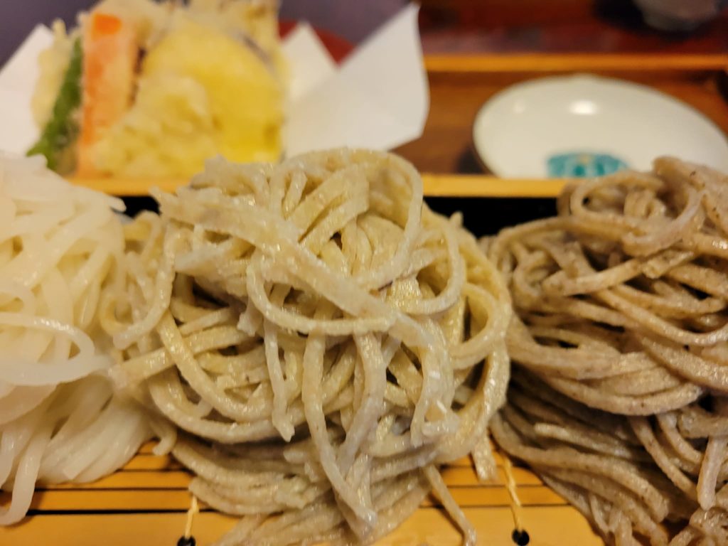 盛りそばの三色を注文しました。更科、挽きぐるみ、田舎の3種類のお蕎麦を味わうことができます。