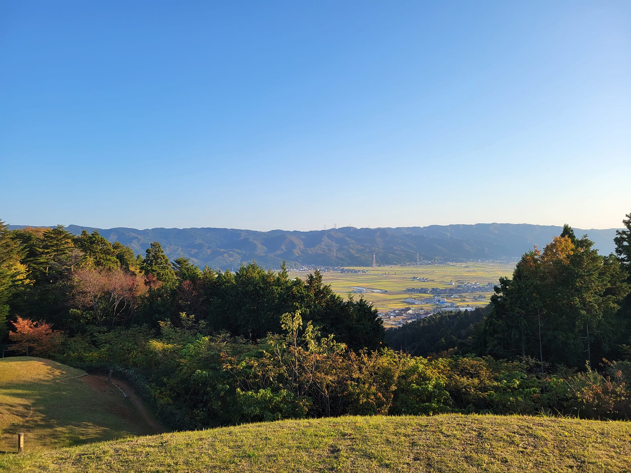 邑知平野を挟んで、向かい側に小田中親王塚古墳が見えるんですよ。