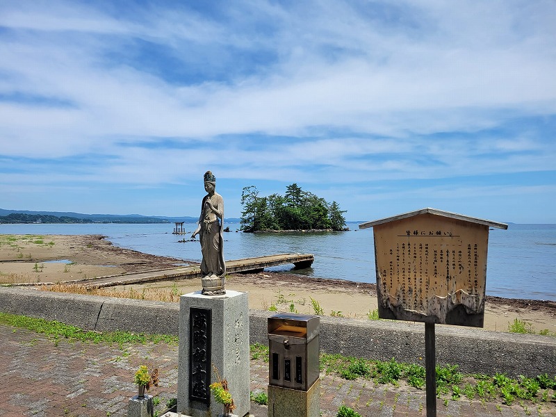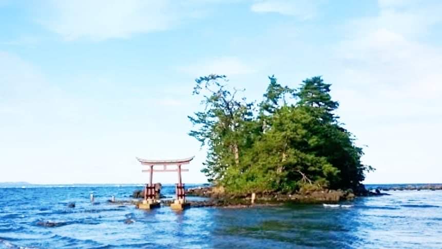 真っ赤に塗られた鳥居の後方に浮かぶ島が「弁天島(べんてんじま)」です。