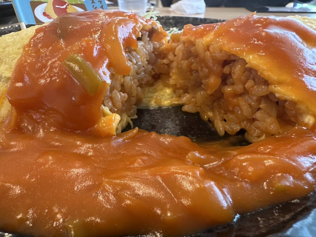 丁度良い味付けのケチャップライスを、ふんわりとした卵で包まれています。 味の決め手は、地元の名産宝達葛(ほうだつくず)を使った特製トマトソース。とろりとしたソースがたっぷりとかかっていて、口に入れた瞬間に広がる旨味がたまりません。