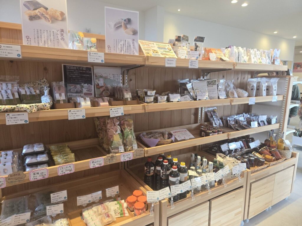 木の温かみを感じる店内に入ると、地域の特産品がずらり!