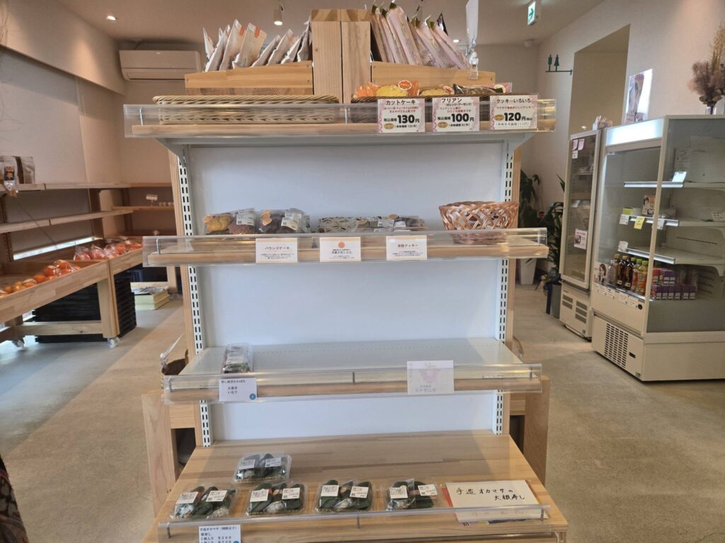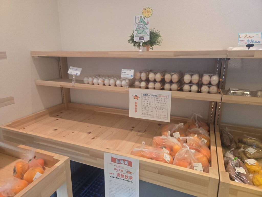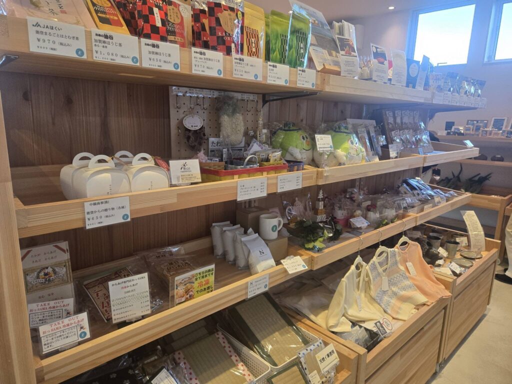 入口を入って左側にある直売コーナーには、地元の特産品や加工品がずらりと並びます。ここ宝達志水町で採れた野菜や果物、お米、地元養鶏所ナカヤマエッグさんの卵、伝統の宝達葛(ほうだつくず)、そして町内のお店が作るこだわりの商品が所狭しと並びます。