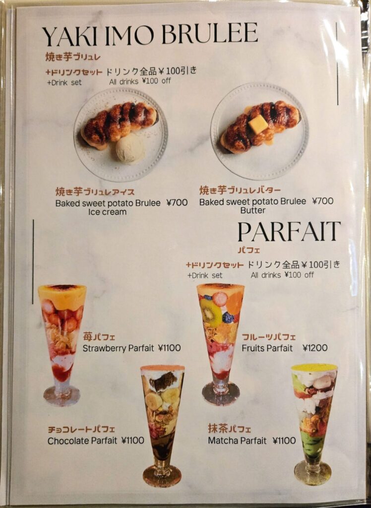 いろいろな種類のパンケーキや、焼き芋ブリュレ、パフェ、ドリンクがあります。