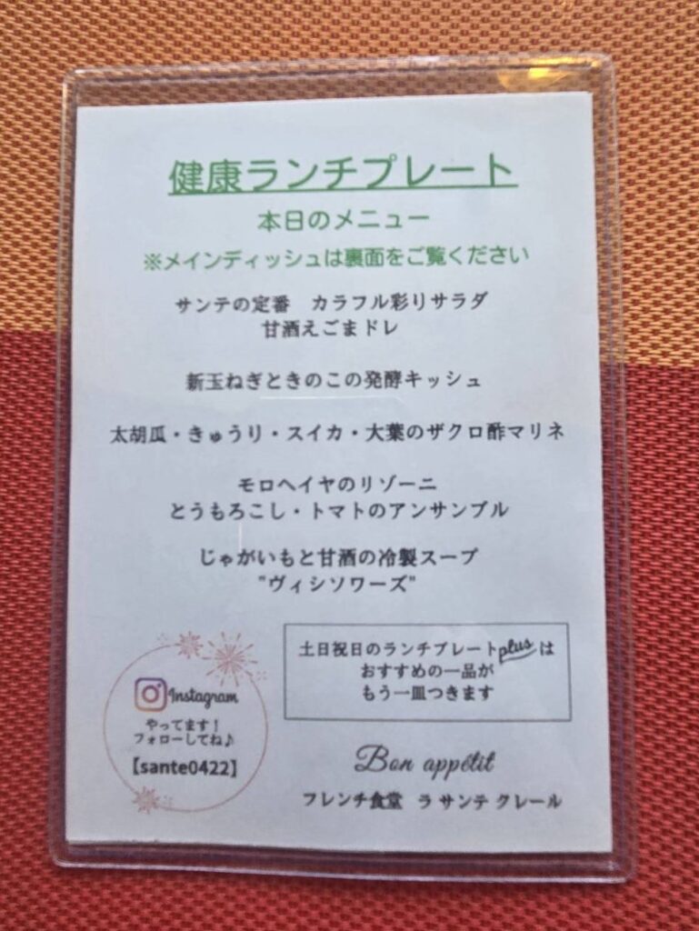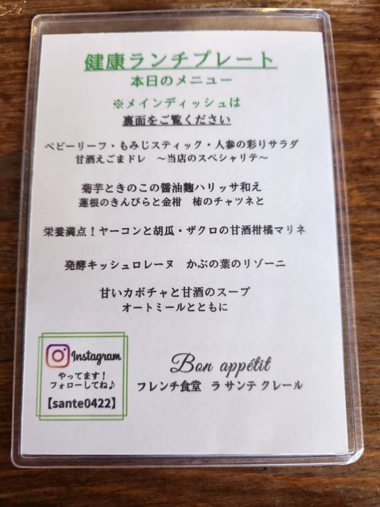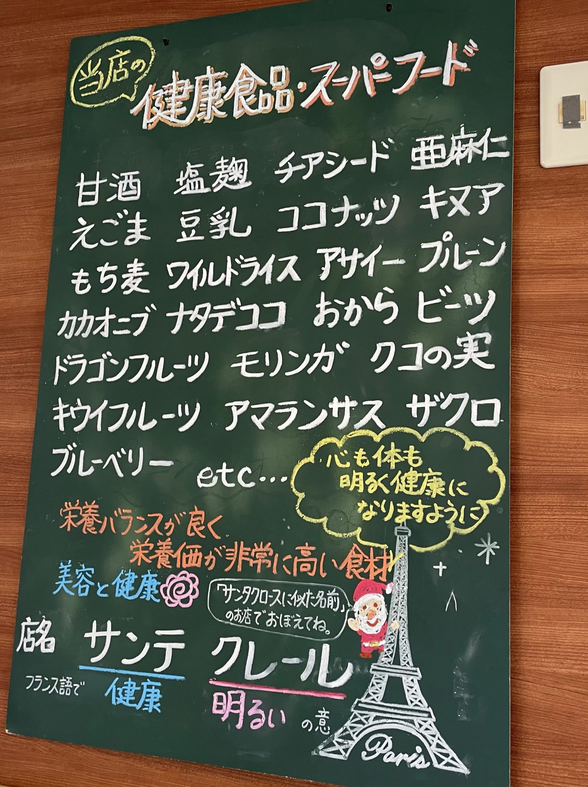 お店の名前の由来も書かれています。フランス語で「サンテ」が「健康」、「クレール」が「明るい」を意味するとのことです。