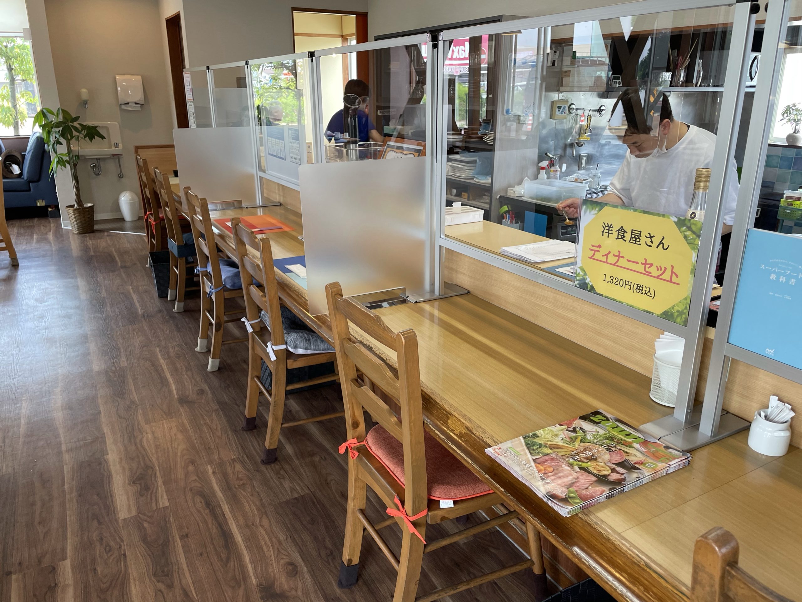 店内は明るい雰囲気です。右側のキッチンに面してカウンター席、左側(道路側)に4人掛けのテーブル席が3つと、2人がけの席が一つあります。