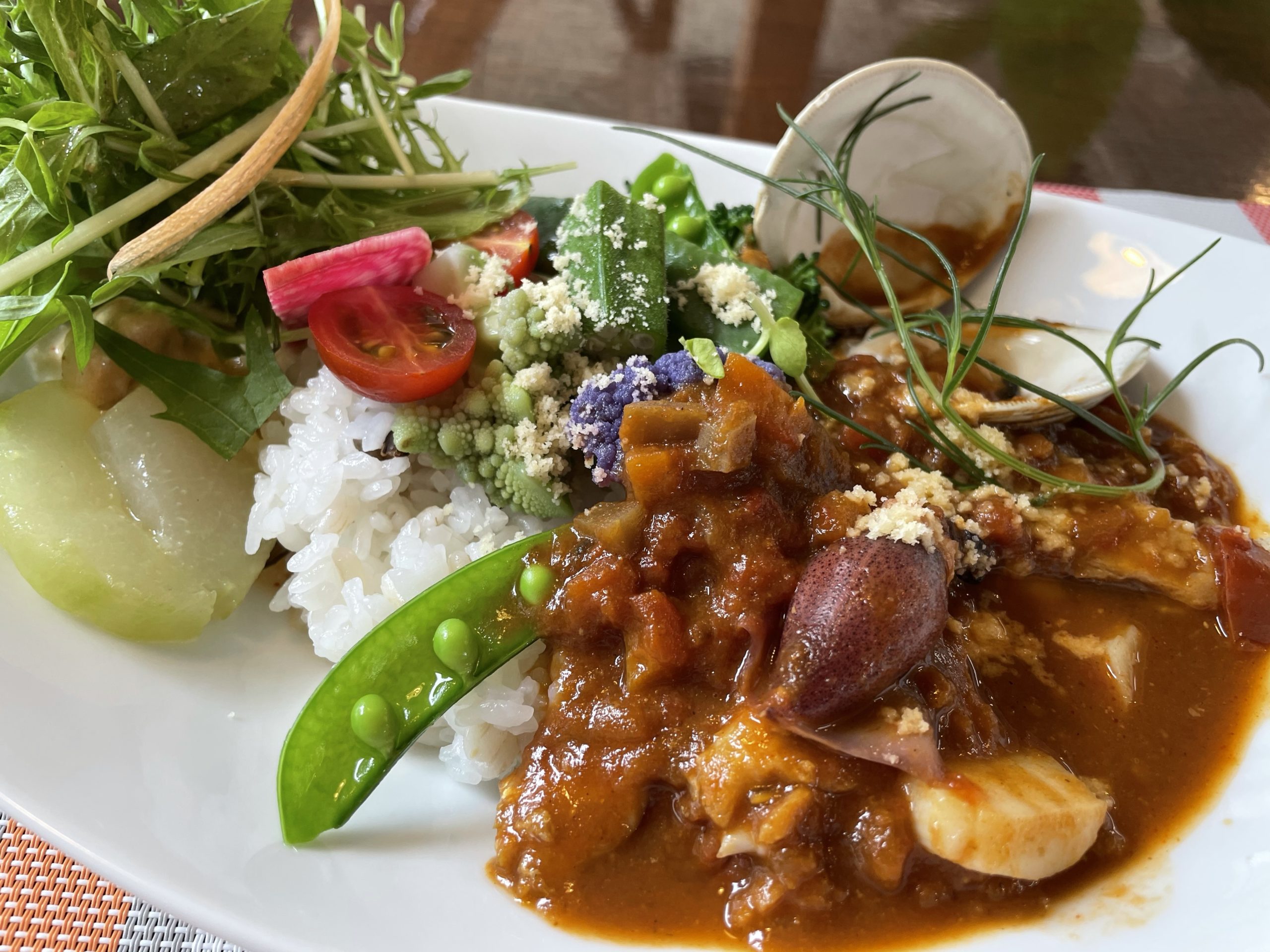 見た目は野菜が目立ちますが、しっかり魚介の旨味があじわえます。こってりではなく、さわやかな感じのカレーです。
