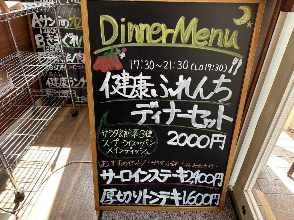 壁の目立つところに大きな黒板があり、こちらのお店が健康にこだわっていることがよく分かります。