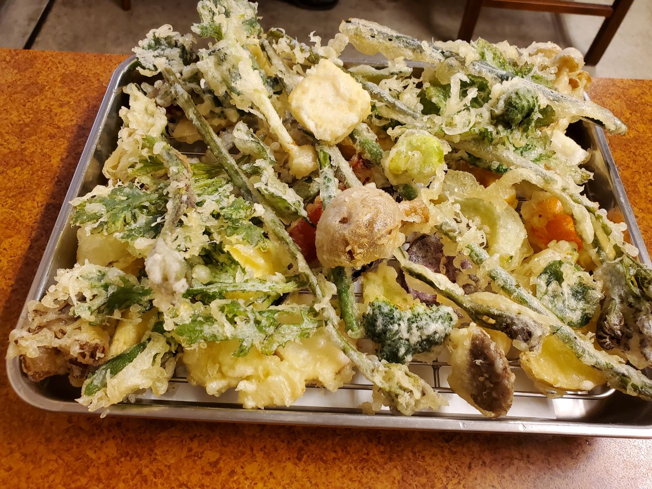 緑や黄色、赤や白、紫色など、とても色鮮やかな野菜の天ぷらが大きめのバットに乗って大量に運ばれてきました。全て種類が違うそうで40種類はあるようです。名前もわからず食べた葉物や茎がありました。メニューには、二、三人前と書かれていたのですが、天ぷら定食のメインとして三人前として出ても多いのではないかと思うくらいです。そして、揚げ方が抜群に上手で美味しい!