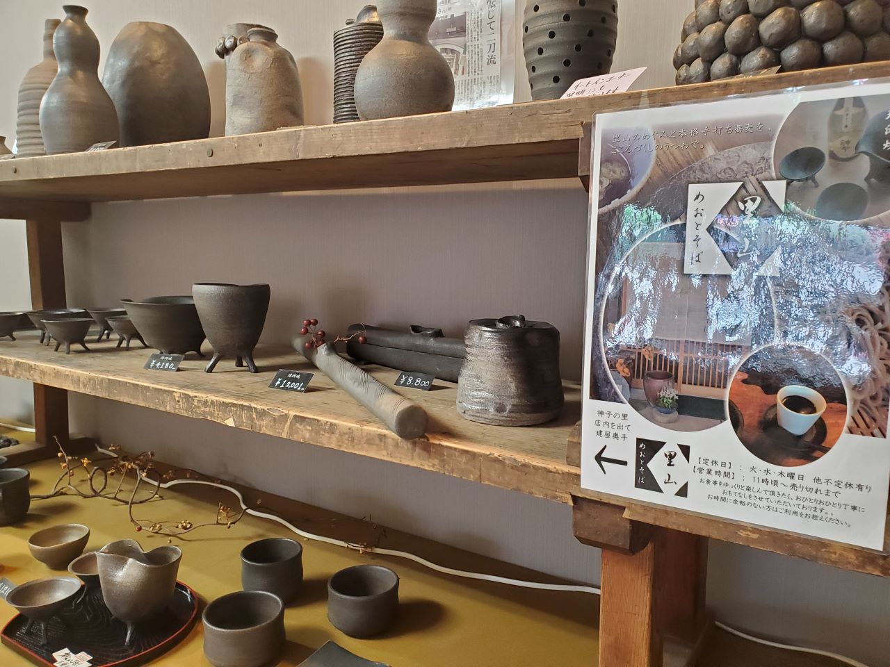 木下さんが作られた焼き物は、隣の直売所で販売されているとお聞きしたので、そばを食べ終わってから早速直売所へ足を運びました。直売所に行くと、珠洲焼コーナーには、めおとそば里山の案内も出ていました。