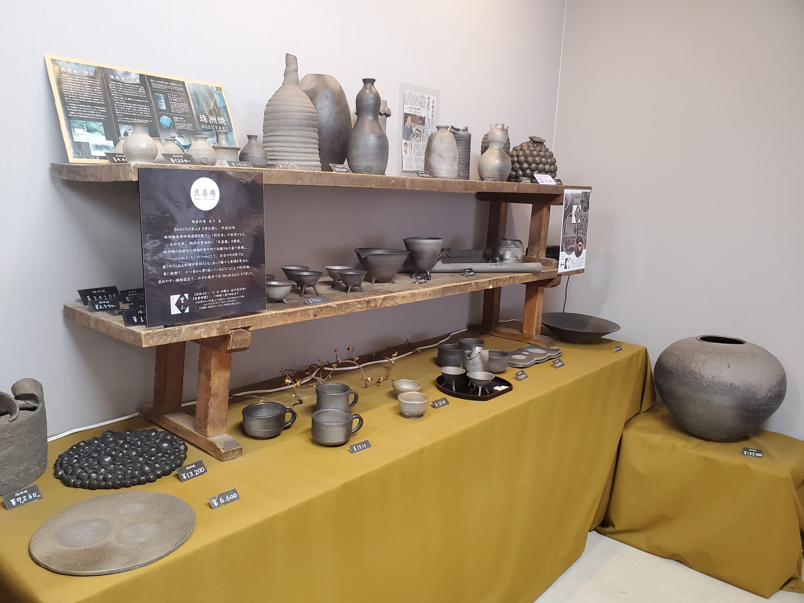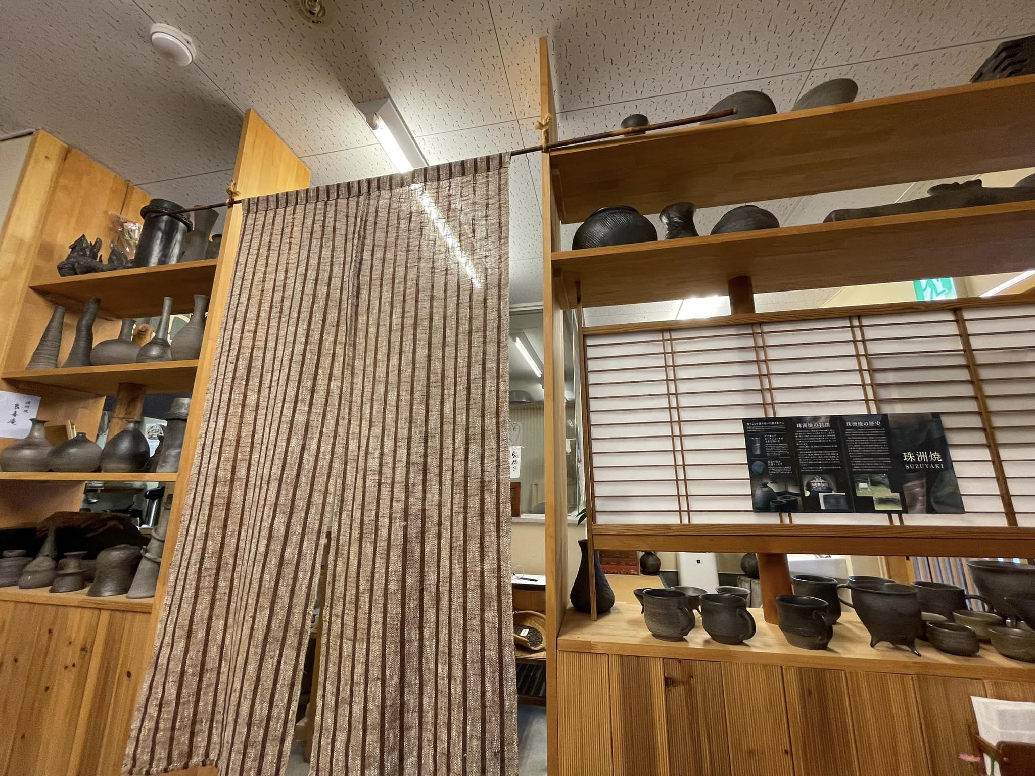 食事場所と入口の間には棚の仕切りがあり、棚にはたくさんの焼き物が飾られていました。