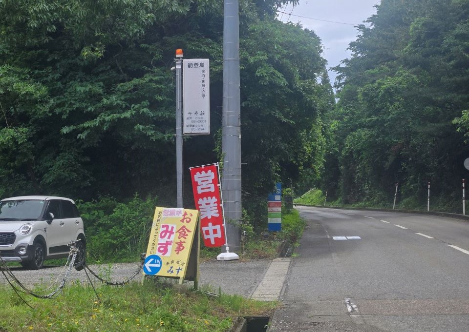 ツインブリッジから5分程の道路に面した場所にあるのですぐにわかると思います。営業中の旗、「お食事みず」と書かれた看板を目印にしてください。