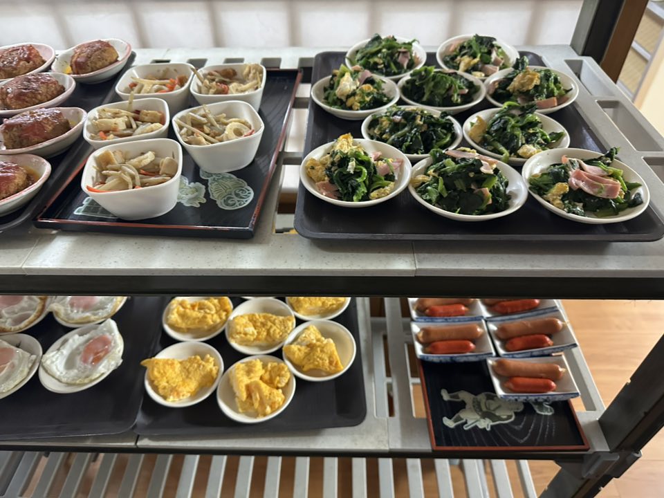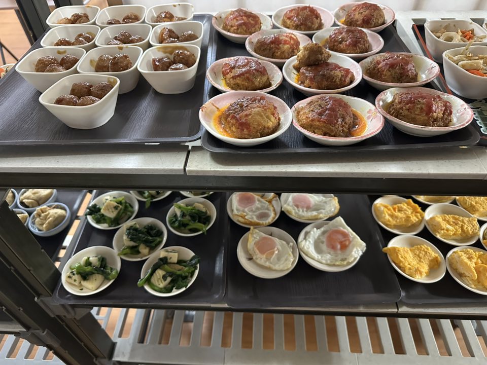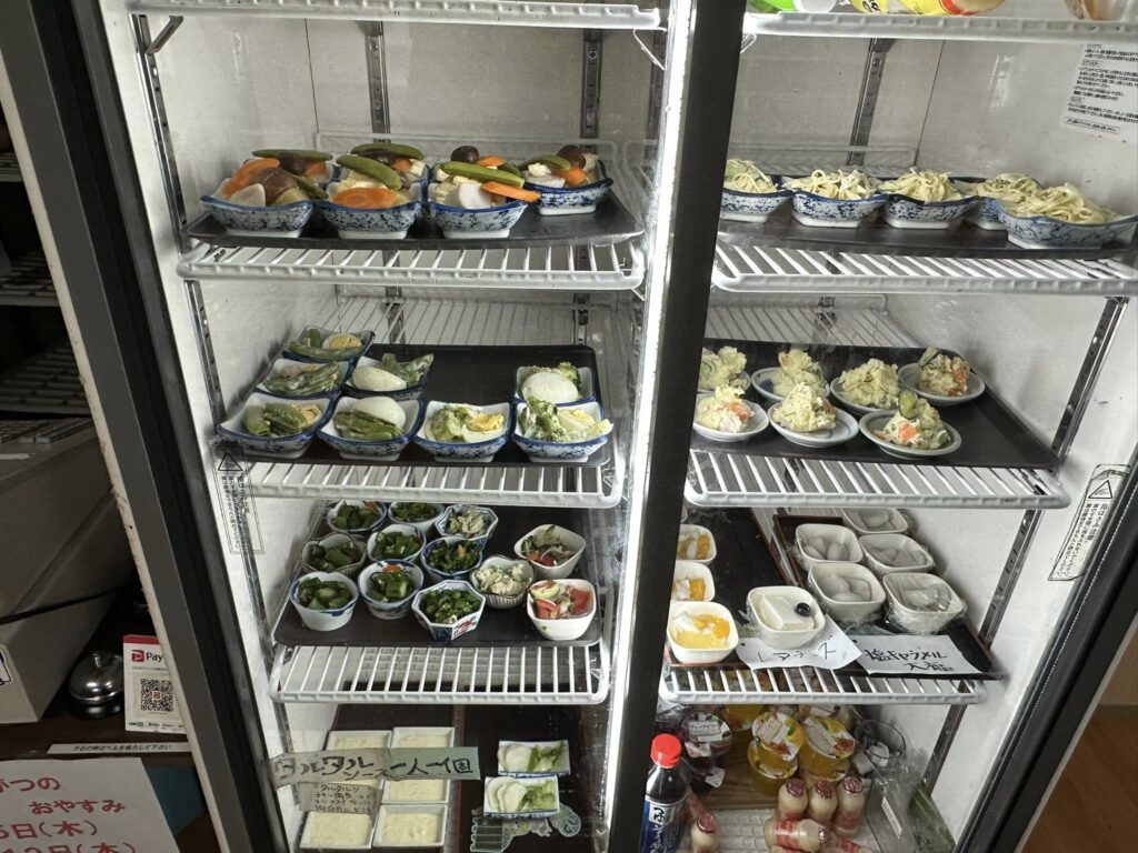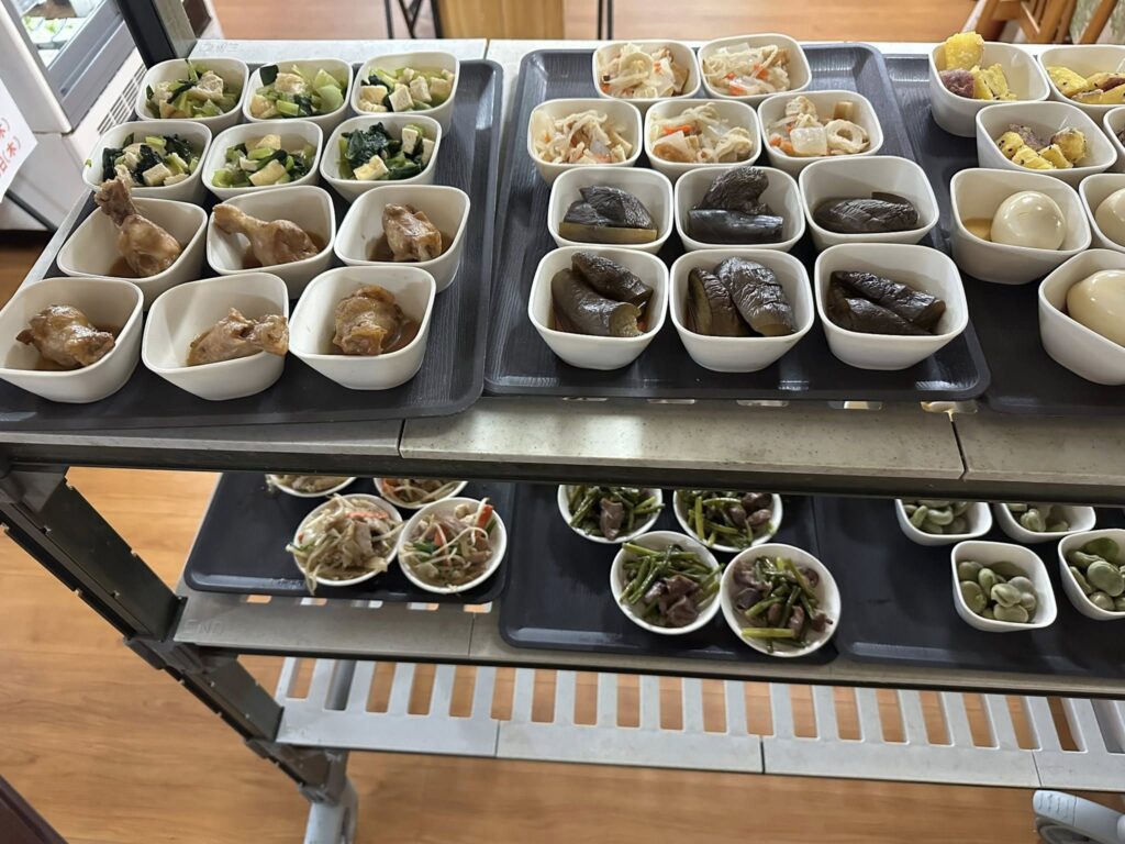 玄関先のフロアーにある棚には、ハンバーグ、卵料理、煮物、野菜炒めなど数種類の小鉢が並んでいます。棚の横には冷蔵庫もありますのでそちらも忘れずみてくださいね。サラダやデザートなどが入っていますよ。