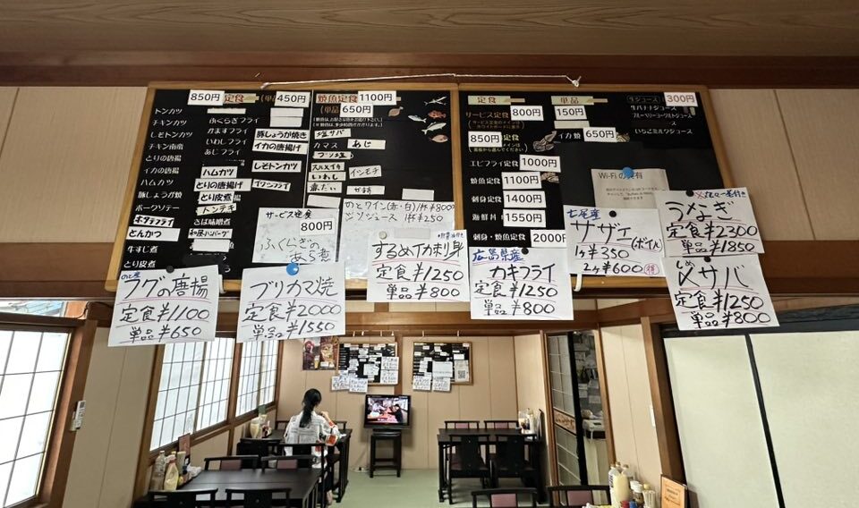 店内の壁には黒板があり、定食のメインとなるおかずが書かれています。お肉や魚から自由に選べるのが魅力的で、旬の魚の名前もたくさん並んでいます。その豊富な選択肢に、どれを選ぼうか迷ってしまいそうです。